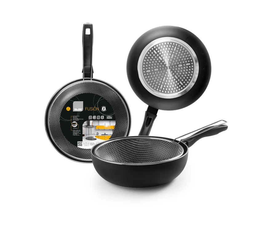 La Sartén freidora Fusion está fabricada en aluminio para inducción con mango de baquelita tacto suave. Es especial para vitrocerémica e inducción y apta para todas las cocinas. Incorpora 2 capas de antiadherente de alta calidad, libre de PFOA, Su fondo de acero inoxidable 18% permite un calentamiento uniforme y rápido para un ahorro energético. Incorpora 2 capas de antiadherente de alta calidad, libre de PFOA. Dispone de una cestillo de acero inoxidable con mango ideal para manipular frituras.